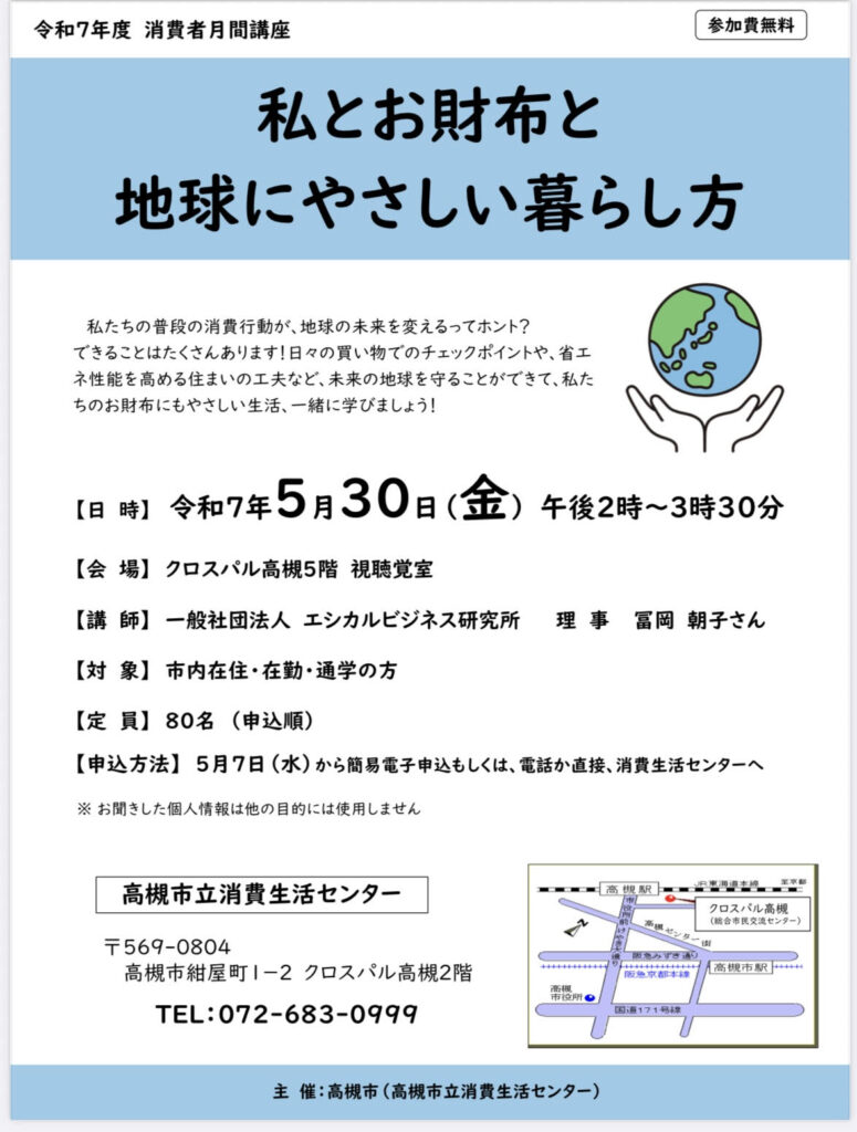 2025年5月30日(金)午後に開催された高槻市消費者月間講座「私とお財布と地球にやさしい暮らし方」において、当団体理事が講師を務めました。会場には59名の方にご参加いただきました。